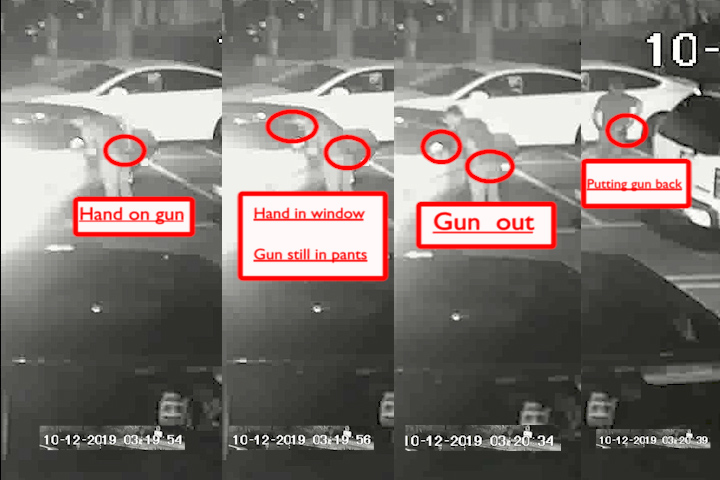 Two parking lot surveillance cameras captured the events in the parking lot that evening. One of the videos (see Parking Lot Surveillance Video #1) clearly showed that Jerry never pointed a gun at anyone. The parking lot surveillance video below captured the car burglaries that were reported to Jerry.